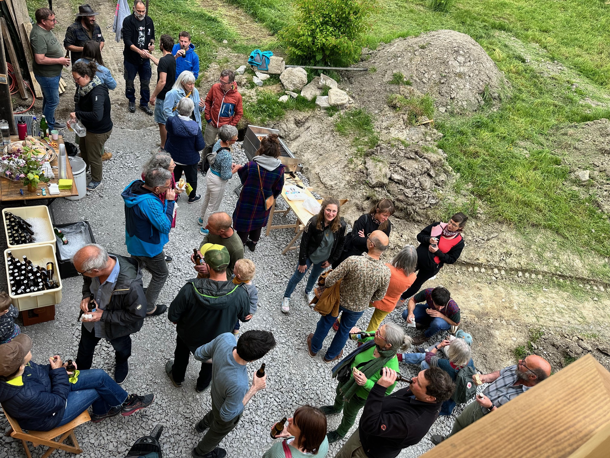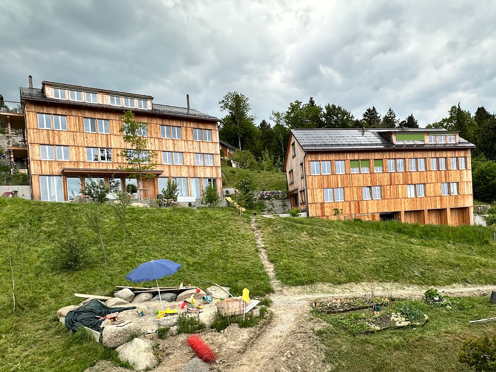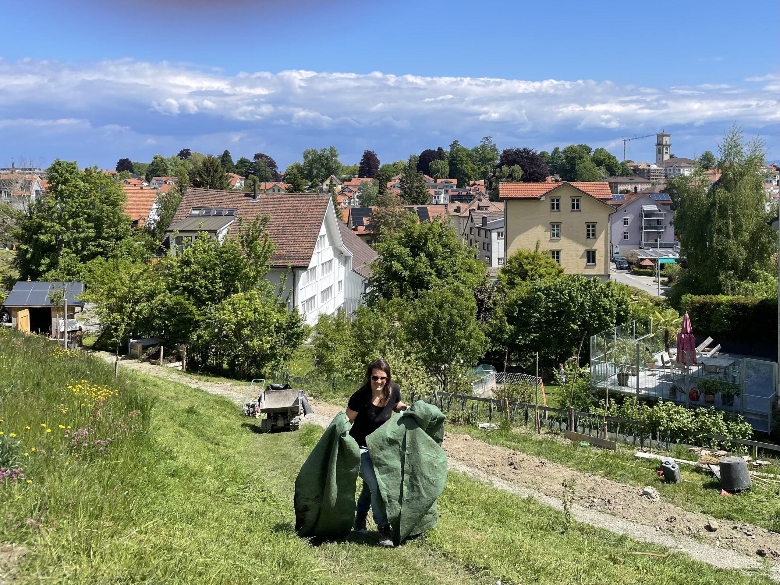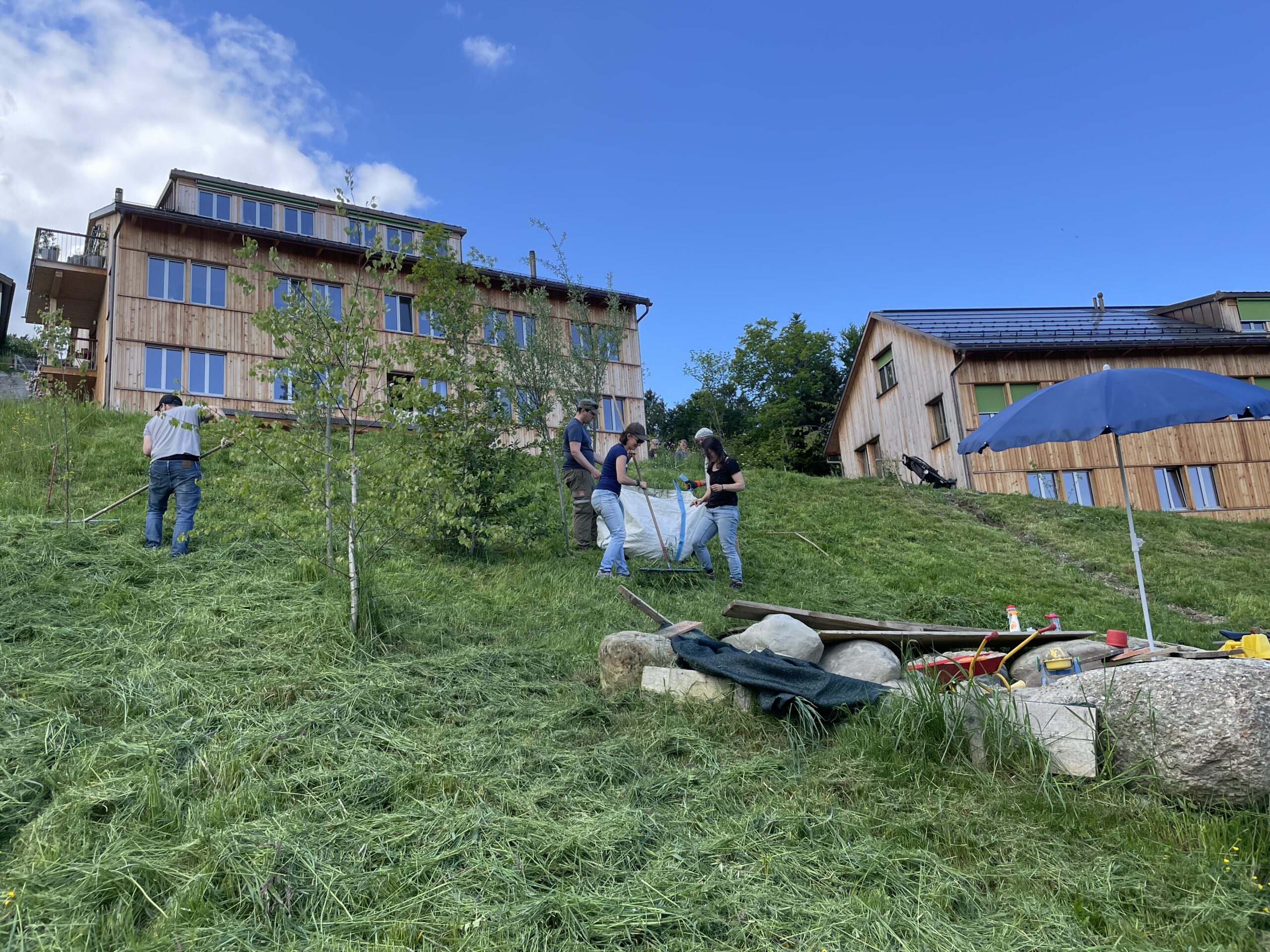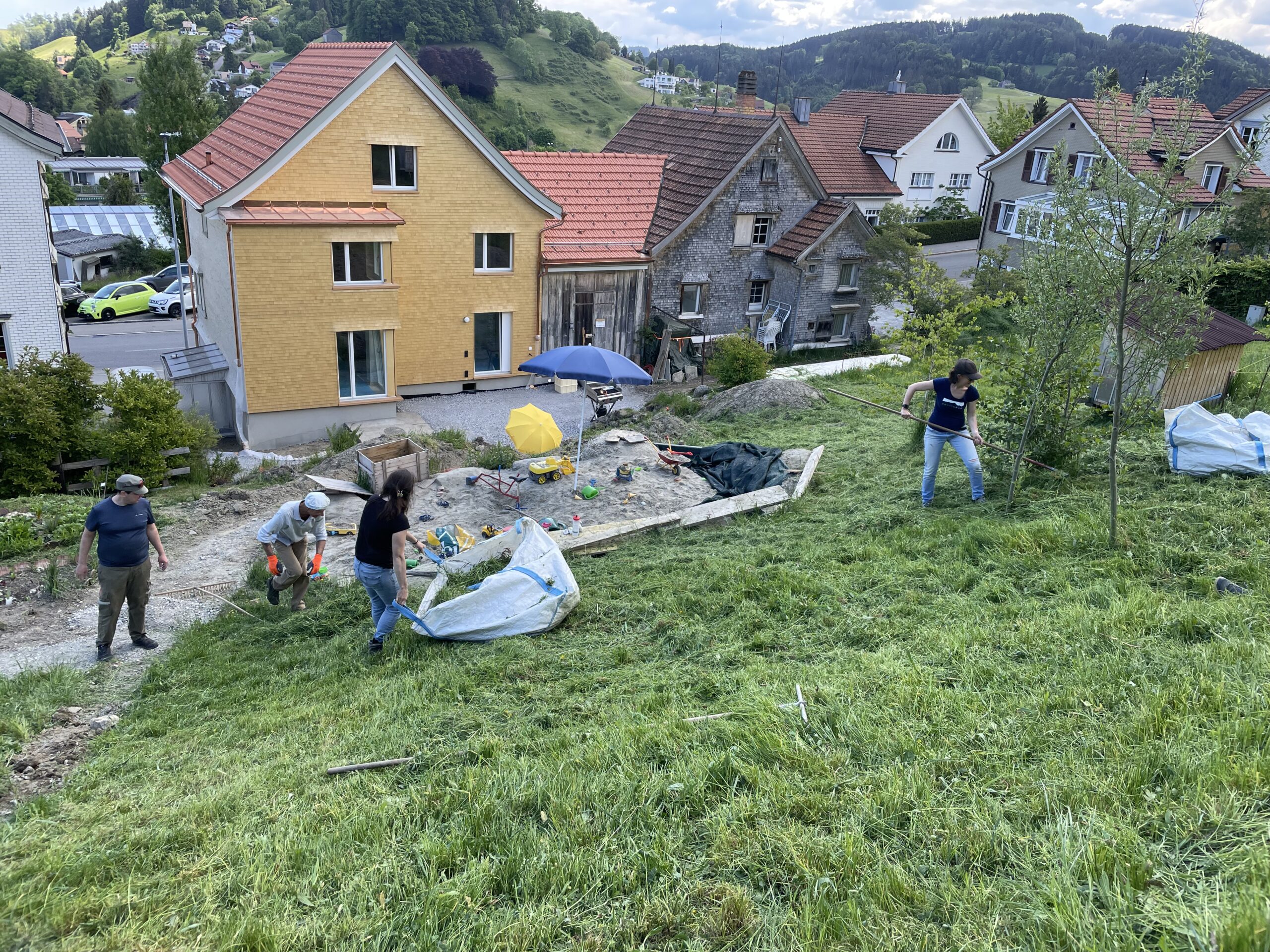 Mai 2020 – Nach ausgiebigem Platzregen fliesst lehmiges Wasser von der Strassen-Baustelle durch den Garten und in den Schwimmteich und überschwemmt den Keller von Haus Einsicht